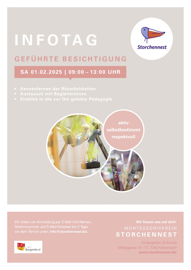Unsere LernbegleiterInnen nehmen sich gerne Zeit, dich durch die vorbereitete Umgebung aller Altersgruppen (Kindergarten und Schule) zu begleiten und deine Fragen zu beantworten. Wir bitten dich um rechtzeitige Anmeldung mit Name und Telefonnr. an info@storchennest.biz.